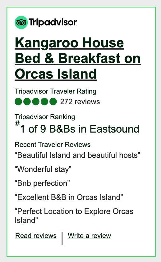 Kangaroo House Bed and Breakfast is also featured and recommended in Moon Handbook’s Guide to the San Juan Islands, their Guide to Washington State, The Essential San Juan Islands Guide, Washington- An Explorer’s Guide, and countless other sites and blogs. Also, enjoy reading our Yelp reviews.