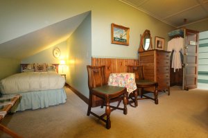 *Note: Guests tell us they find the enclosed Queen bed to be particularly romantic and very comfortable, but it is not well suited for the mobility impaired. If you are up and down often at night, use a c-pap machine, or just don’t like the idea of climbing in and out of the sleeping chamber, plan on using this room’s twin bed under the eave or make a different room choice. If no other room choice is available, call us to help you find another place to stay.